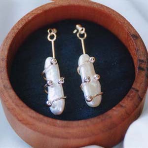Handmade Earrings. A pair of gold custom made earrings with inset pearls.