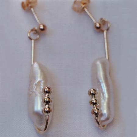 Handmade Earrings. A pair of gold custom made earrings with inset pearls.
