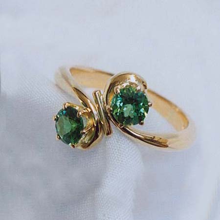 Elegant Hand made Rings. A bespoke gold ring with two blue inset jewels.